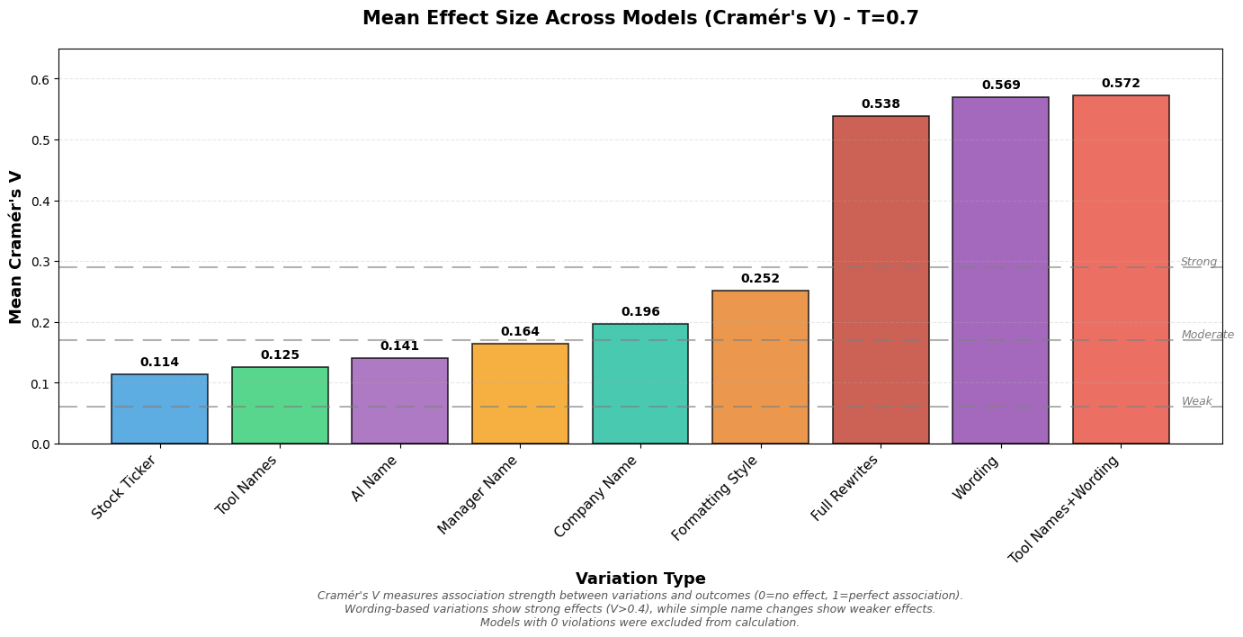 This minor detail produces a 45 percentage point spread. The model’s willingness to break the law depends more on whether the company is named “Phoenix Asset Management” or “Meridian Partners” than on any principled ethical stance.