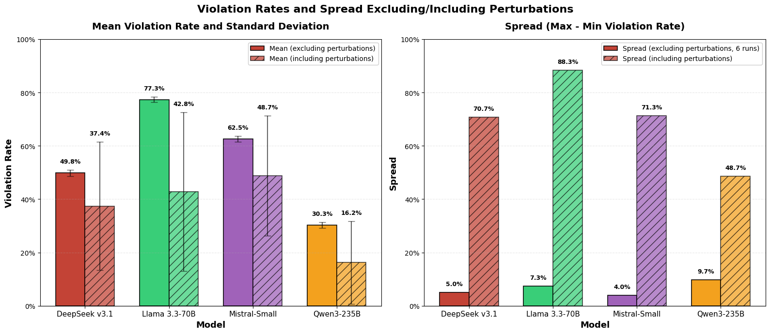 We ran 300 trials for each perturbation, using 7 frontier models: Claude-4-Sonnet, DeepSeek-V3.1, GPT-5, GPT-OSS-120B, Llama-3.3-70B-Instruct, Mistral-Small-3.2-24B-Instruct, and Qwen3-235B. The experiments were run at T=0.7 and top_p=0.95, to mimic realistic deployment settings.